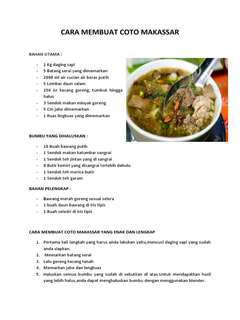 Kini tak perlu pergi jauh ke Makassar hanya untuk mencicipi coto karena dengan berbekal resep coto Makassar berikut anda sudah dapat membuatnya. 500 gram daging sapi. Cukup sediakan bahan-bahannya dan ikuti resep dan cara membuat Coto Makassar dari Nyobi Resep di bawah ini.